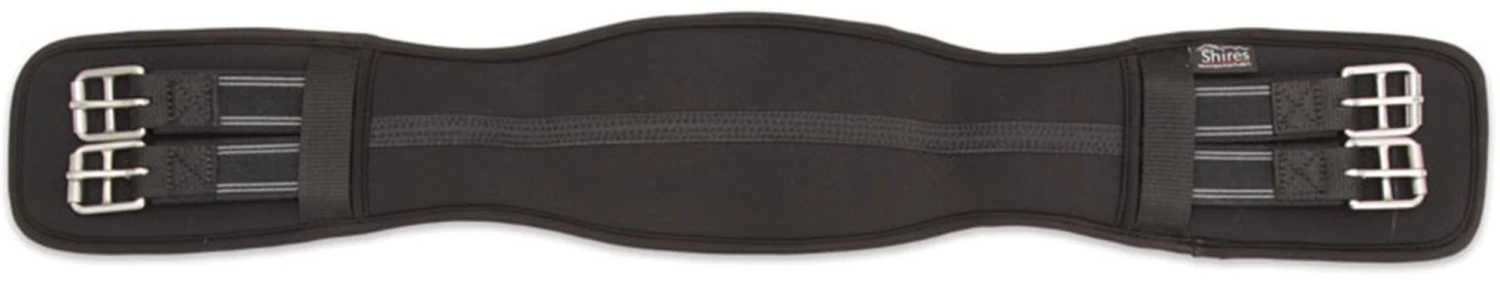 Arma Neoprene Dressage Girth has a soft, padded neoprene helps reduce friction and moisture build up to help protect against galls and rubbing. Double layer elastic inserts at both ends help to distribute pressure. Roller buckles for easy tightening.