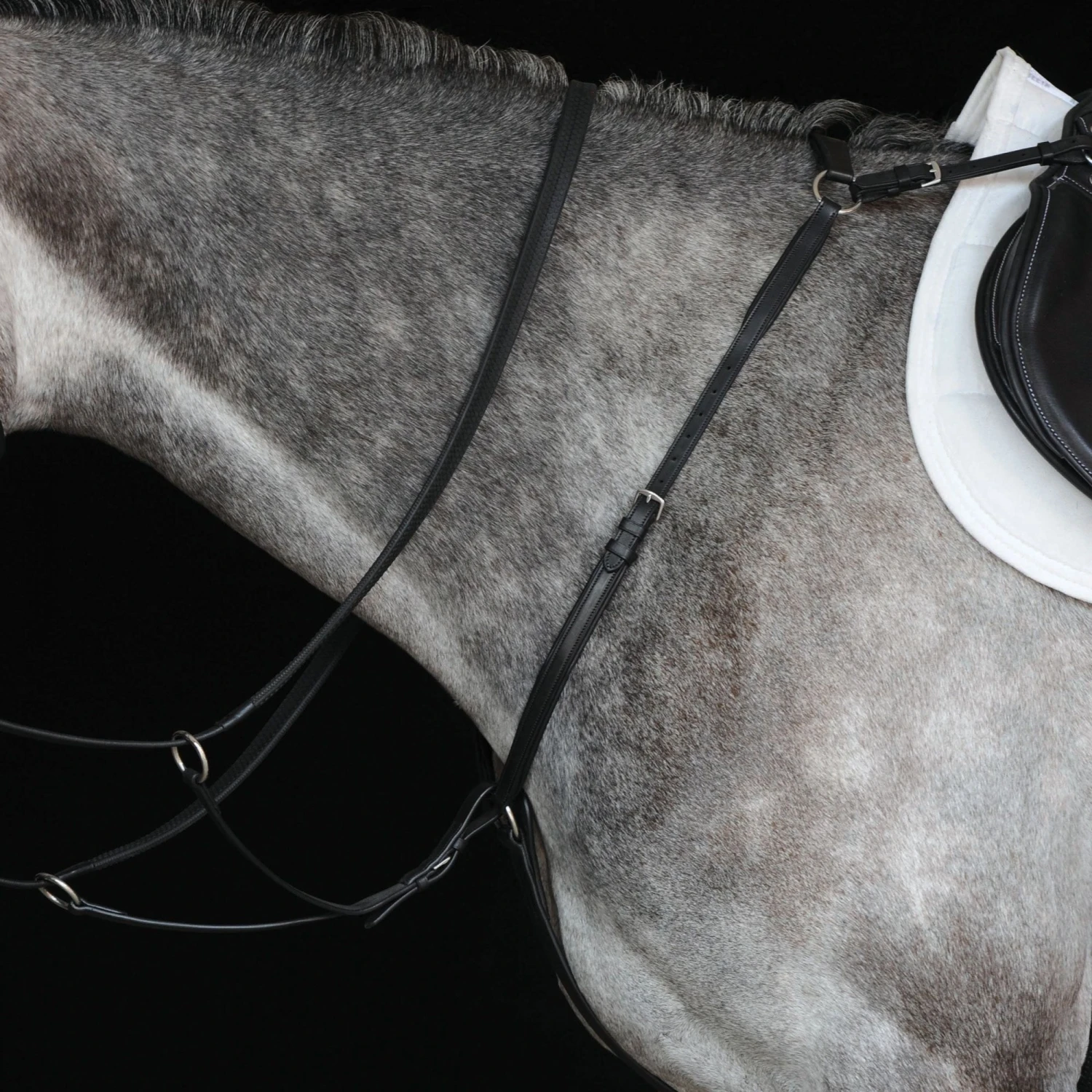 Collegiate Hunter Breastplate IV is an attractive breastplate which caters to most discliplines and is the style preferred by hunter/jumper riders.This breastplate is constructed of quality European leather with highly polished stainless steel fittings. Matching running attachment included.