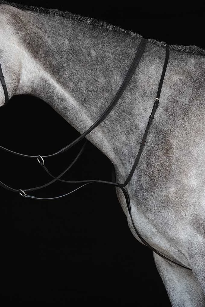 Collegiate Running Martingale offers adjustable neck stap and girth loop for a comfortable fit as well as it spiltting into two straps from the neck strap with a stainless steel ring on each for the reins to easily pass through.