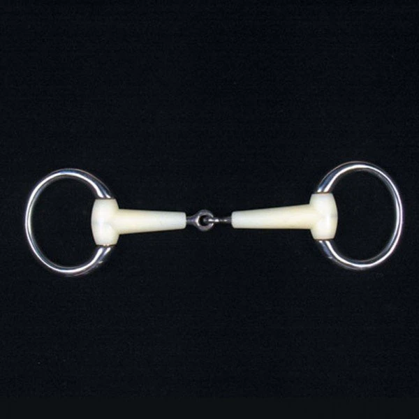 Happy Mouth Dressage Eggbutt Jointed Bit apple scented, tough, non-toxic, flexible mouth with reinforcing stainless steel. The single joint puts pressure on the sides of the tongue, on the lips and on the bars due to the nutcracker. The single jointed bits also may have a head raising action so would be less suitable for your horse if they ride with a high head carriage or above the bit.