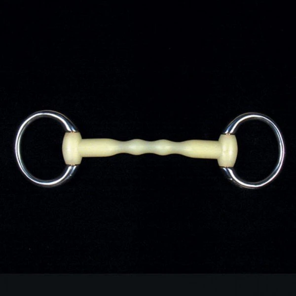 Happy Mouth Dressage Eggbutt Straight Bit apple scented, tough, non-toxic, flexible mouth with reinforcing stainless steel. The Straight bar is a very mild mouthpiece; it is an unvarying mouthpiece, which means the pressure on the mouth doesn’t change very much, as it is a fixed mouthpiece. The bit puts pressure on the tongue and lips (corner of the mouth), it does use slight pressure on the bars depending on the size of your horses tongue. This bit is very useful for those horses who have a very soft mouth and don’t like complicated mouthpieces, it may also be useful for horses who back off the contact and need that extra bit of confidence in the bit.