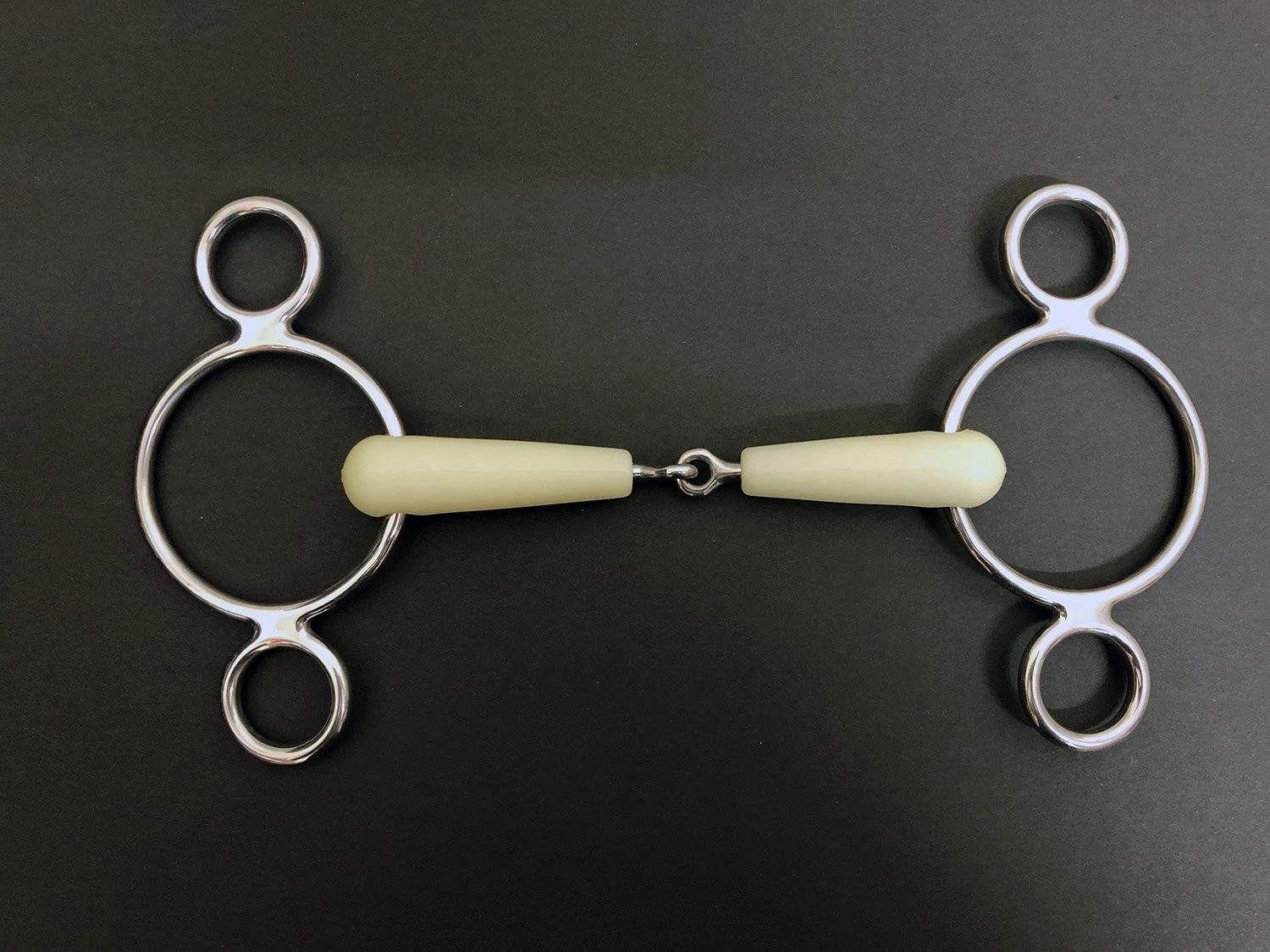 Happy Mouth Show Jump Jointed Bit 2 Ring apple scented, tough, non-toxic, flexible mouth with reinforcing stainless steel. The Continental Gag should be worn with 2 reins preferably; the first rein should be used on the snaffle ring, which is the first ring adjacent to the mouthpiece. When the first rein is attached to the snaffle rein it is used just like a loose ring hanging cheek bit, which uses poll pressure and lip pressure due to the sliding loose ring also applies various pressures in the mouth depending on the mouthpiece it is in conjunction with. When the second rein is attached to the ring below, the pressures are increased as the lower rings produce more leverage. In the instance of using 2 reins then this bit can be used as a hanging cheek bit and then when more help is required, the second rein can be brought into play. If the bit is only used with one rein on the lower ring, then the pressure in applied constantly and no pressure release is available for the horse. The single joint puts pressure on the sides of the tongue, on the lips and on the bars due to the nutcracker. The single jointed bits also may have a head raising action so would be less suitable for your horse if they ride with a high head carriage or above the bit.