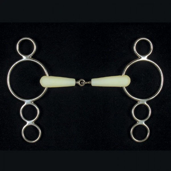 Happy Mouth Show Jump Jointed Bit apple scented, tough, non-toxic, flexible mouth with reinforcing stainless steel. The Continental Gag should be worn with 2 reins preferably; the first rein should be used on the snaffle ring, which is the first ring adjacent to the mouthpiece. When the first rein is attached to the snaffle rein it is used just like a loose ring hanging cheek bit, which uses poll pressure and lip pressure due to the sliding loose ring also applies various pressures in the mouth depending on the mouthpiece it is in conjunction with. When the second rein is attached to the ring below, the pressures are increased as the lower rings produce more leverage. In the instance of using 2 reins then this bit can be used as a hanging cheek bit and then when more help is required, the second rein can be brought into play. If the bit is only used with one rein on the lower ring, then the pressure in applied constantly and no pressure release is available for the horse. The single joint puts pressure on the sides of the tongue, on the lips and on the bars due to the nutcracker. The single jointed bits also may have a head raising action so would be less suitable for your horse if they ride with a high head carriage or above the bit.