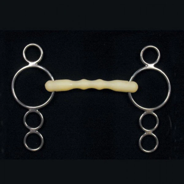 Happy Mouth Show Jump Straight Bit apple scented, tough, non-toxic, flexible mouth with reinforcing stainless steel. The Straight bar is a very mild mouthpiece; it is an unvarying mouthpiece, which means the pressure on the mouth doesn’t change very much, as it is a fixed mouthpiece. The bit puts pressure on the tongue and lips (corner of the mouth), it does use slight pressure on the bars depending on the size of your horses tongue. The Continental Gag should be worn with 2 reins preferably; the first rein should be used on the snaffle ring, which is the first ring adjacent to the mouthpiece. When the first rein is attached to the snaffle rein it is used just like a loose ring hanging cheek bit, which uses poll pressure and lip pressure due to the sliding loose ring also applies various pressures in the mouth depending on the mouthpiece it is in conjunction with. When the second rein is attached to the ring below, the pressures are increased as the lower rings produce more leverage. In the instance of using 2 reins then this bit can be used as a hanging cheek bit and then when more help is required, the second rein can be brought into play. If the bit is only used with one rein on the lower ring, then the pressure in applied constantly and no pressure release is available for the horse.
