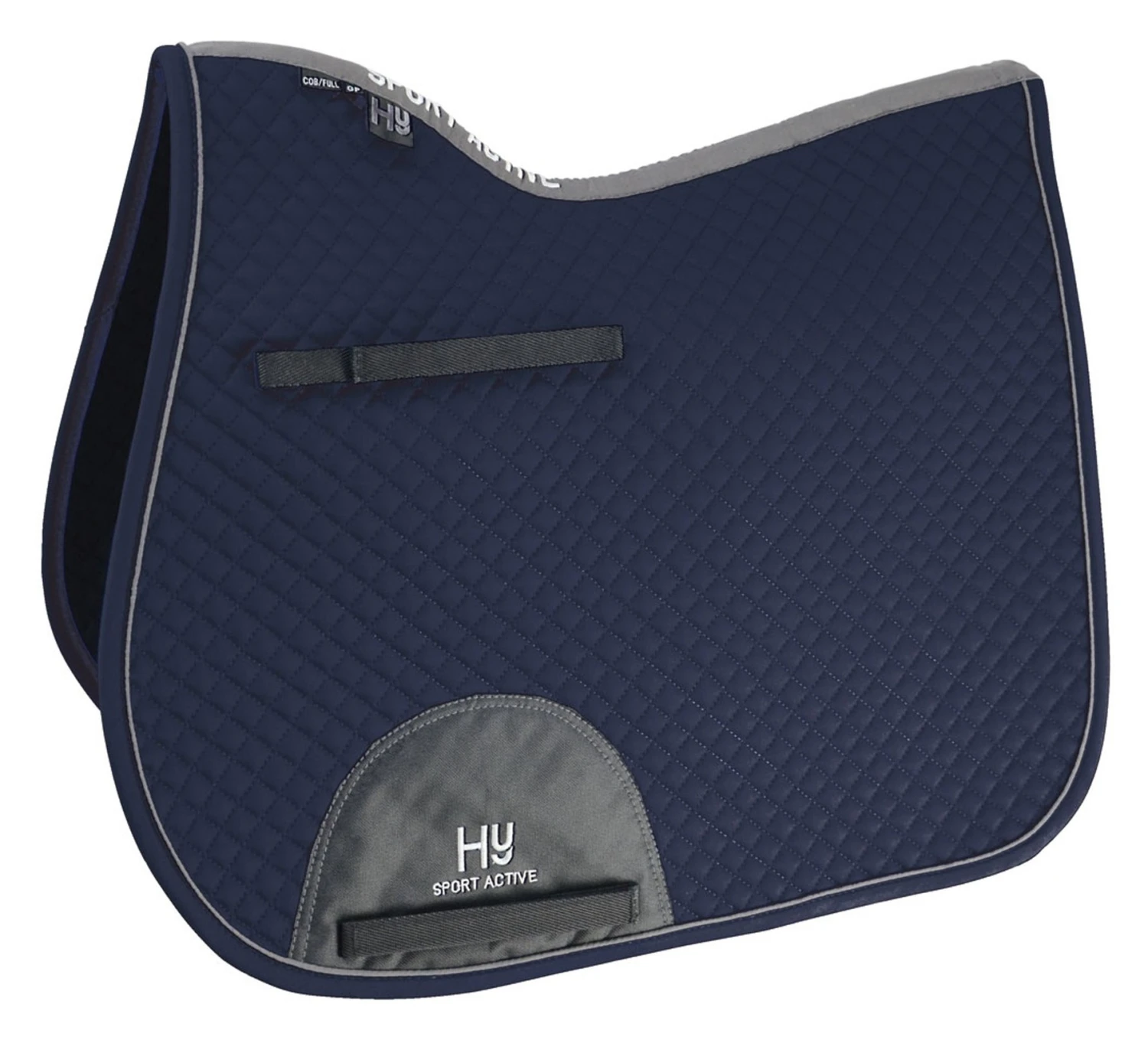 Hy Sport Active GP Saddle Pad Midnight Navy is a traditional and classic shaped general purpose saddle pad, designed to fit a wide range of saddles. Featuring the signature HyWITHER cut to provide clearance over the withers to prevent rubbing. This shape makes it simple to fit and offers ultimate comfort. The pad is made from high-quality cotton and a moisture wicking lining. It also features a durable anti-rub girth cover protection, complete with double touch tape girth loops for a secure and precise fit. Available in all the exclusive Hy Sport Active colours with charcoal grey contrast piping and spine to match the rest of the collection, suiting a variety of horses and tastes.