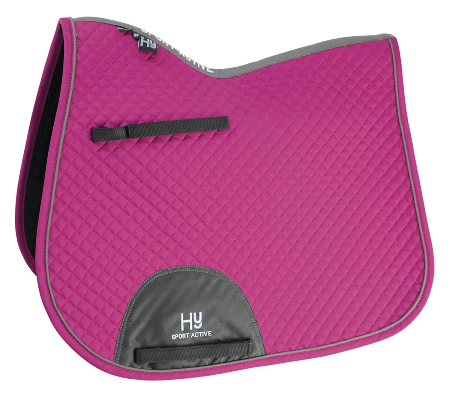 Hy Sport Active GP Saddle Pad Port Royal is a traditional and classic shaped general purpose saddle pad, designed to fit a wide range of saddles. Featuring the signature HyWITHER cut to provide clearance over the withers to prevent rubbing. This shape makes it simple to fit and offers ultimate comfort. The pad is made from high-quality cotton and a moisture wicking lining. It also features a durable anti-rub girth cover protection, complete with double touch tape girth loops for a secure and precise fit. Available in all the exclusive Hy Sport Active colours with charcoal grey contrast piping and spine to match the rest of the collection, suiting a variety of horses and tastes.