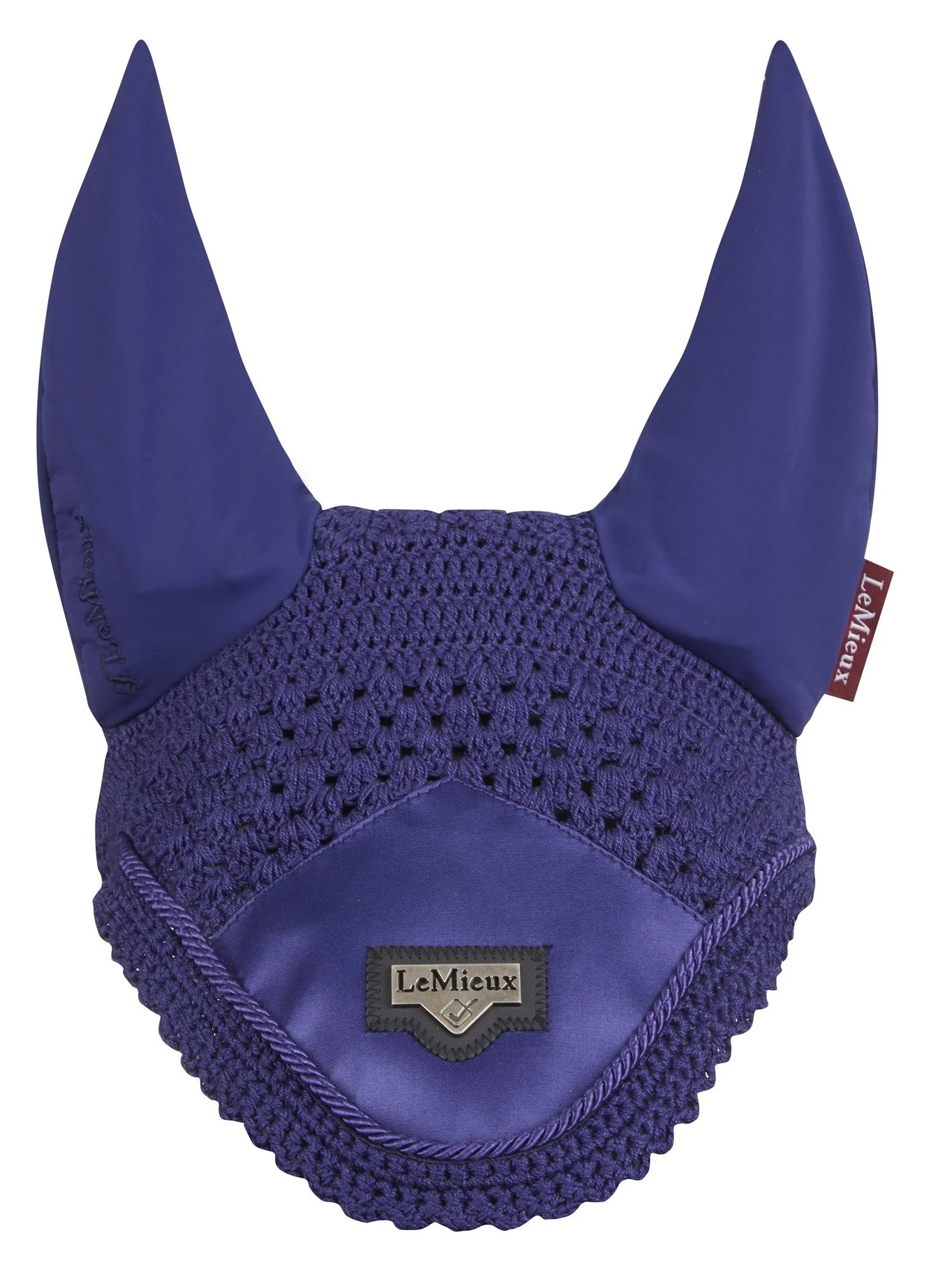 LeMieux Loire Fly Hood Ink Blue supporting the signature LeMieux Loire embossed metal motif these luxurious fly hoods are a stylish addition to the collection. Beautifully made from three-way hand knitted crochet with a luxurious satin fabric front piece and soft stretch Lycra ears.