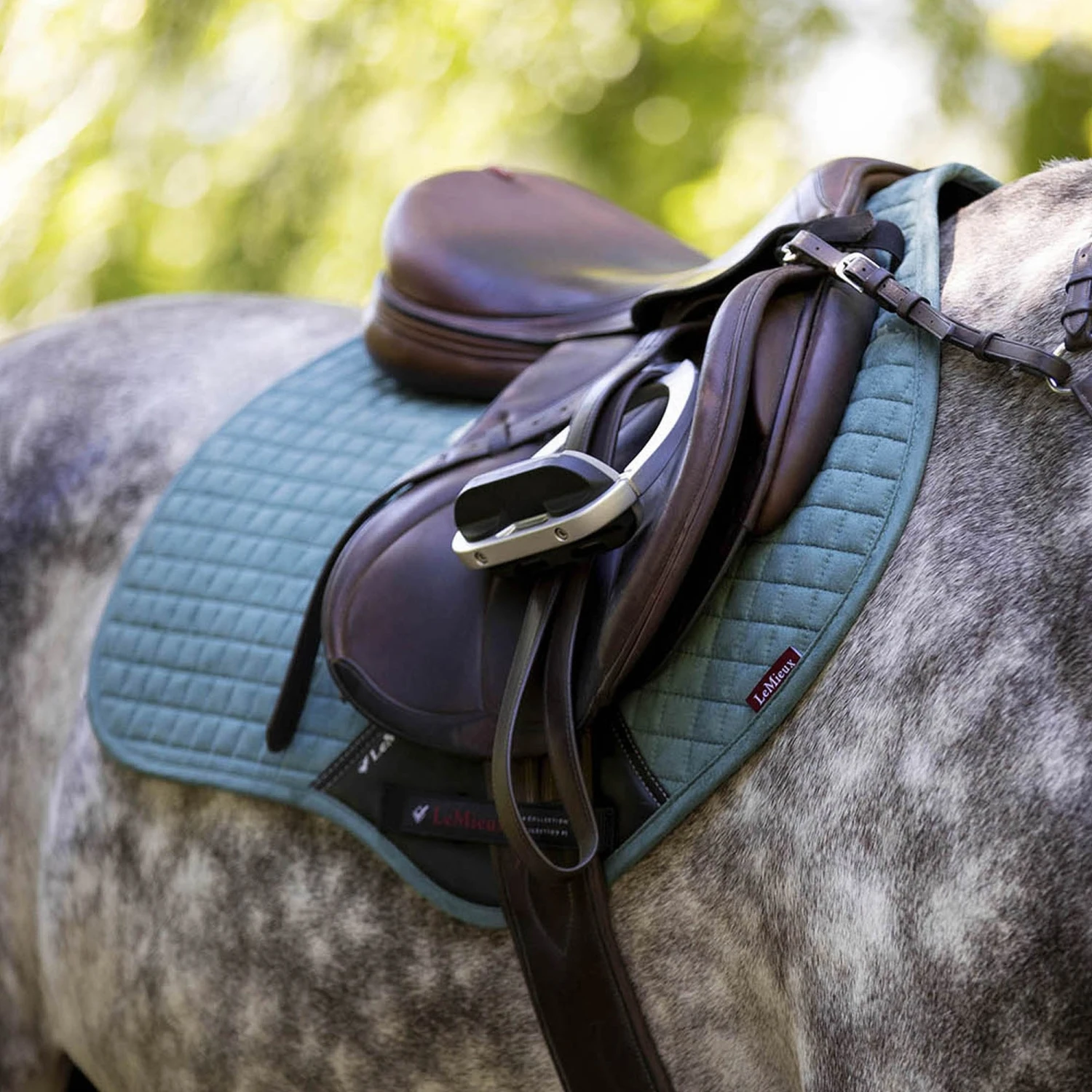 LeMieux Pro Sport Suede Close Contact Square Sage sets new standards in style & comfort. Now established as the iconic LeMieux look when combined with matching polo bandages and fly hoods there are colours to suit most horses and tastes. Designed to fit a wide range of dressage saddles with its high wither and elasticated D-Ring tabs . The luxurious suede top side with soft suede binding is complimented by a new super soft Bamboo lining to absorb & control sweat under the saddle and are beautifully comfortable and secure – minimising friction.