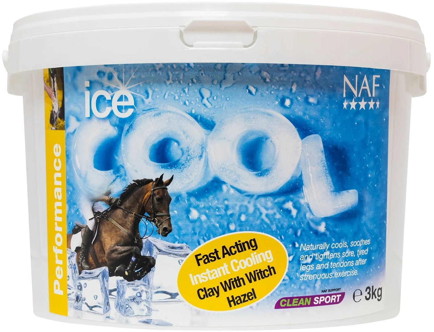 NAF Ice Cool ice cool therapy for tired legs. Ice Cool has been developed to naturally cool, soothe and tighten sore, tired legs and tendons following strenuous exercise. Supporting cool, hard legs is an essential pre-requisite of any performance horse in order for them to be able to perform consistently. Ice Cool is a highly effective 24 hour cooling clay, containing a blend of natural clays, together with Witch Hazel and Arnica, both well known for their naturally astringent qualities. Their cooling actions work together with the tightening effects of the natural clays to soothe any resultant soreness, tighten the tendons, ‘harden’ the legs and help eliminate any potential filling of the lower limbs. Ice Cool is also really cool to use – it’s easy to apply and even easier to wash off! It readily rinses away under a cold water hose. Ice Cool is simply the coolest product you can have in your kit box!