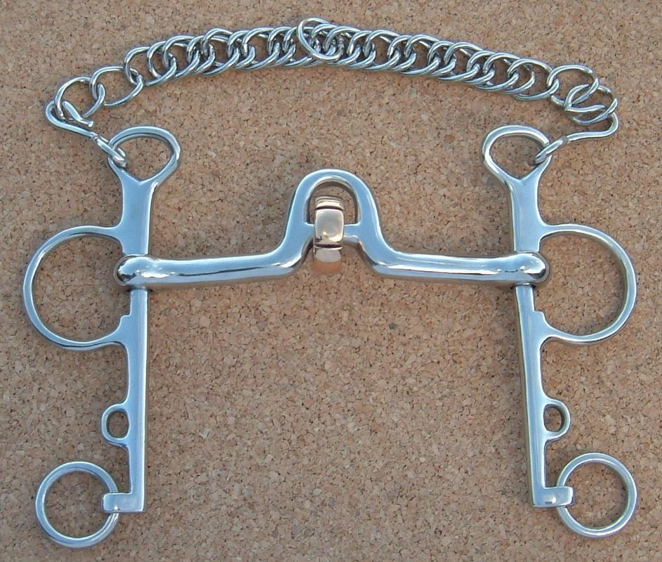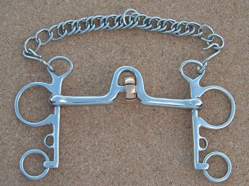 Pelham Coscoquero Roller Mouth Bit the coscoquero pelham is a high ported pelham with a central copper wheel in the middle. The Coscoquero if useful for horses that try to get their tongue over the bit or lean, and can also have the action of raising the horses head. Pelham bits are designed to be used with two reins, the ‘snaffle’ rein on the larger ring which should have a constant contact, and the curb rein is attached to the smaller loose bottom ring and is used when needed. The small hole in the shank just above the curb ring is for a lip strap, not essential but correct for showing and helps to keep the curb chain flat. If the rider wishes to use only one pair of reins, roundings can be used to join the snaffle and curb rings together and the reins go on the loop of leather to give an action on both mouthpiece and curb when the rein is pulled.