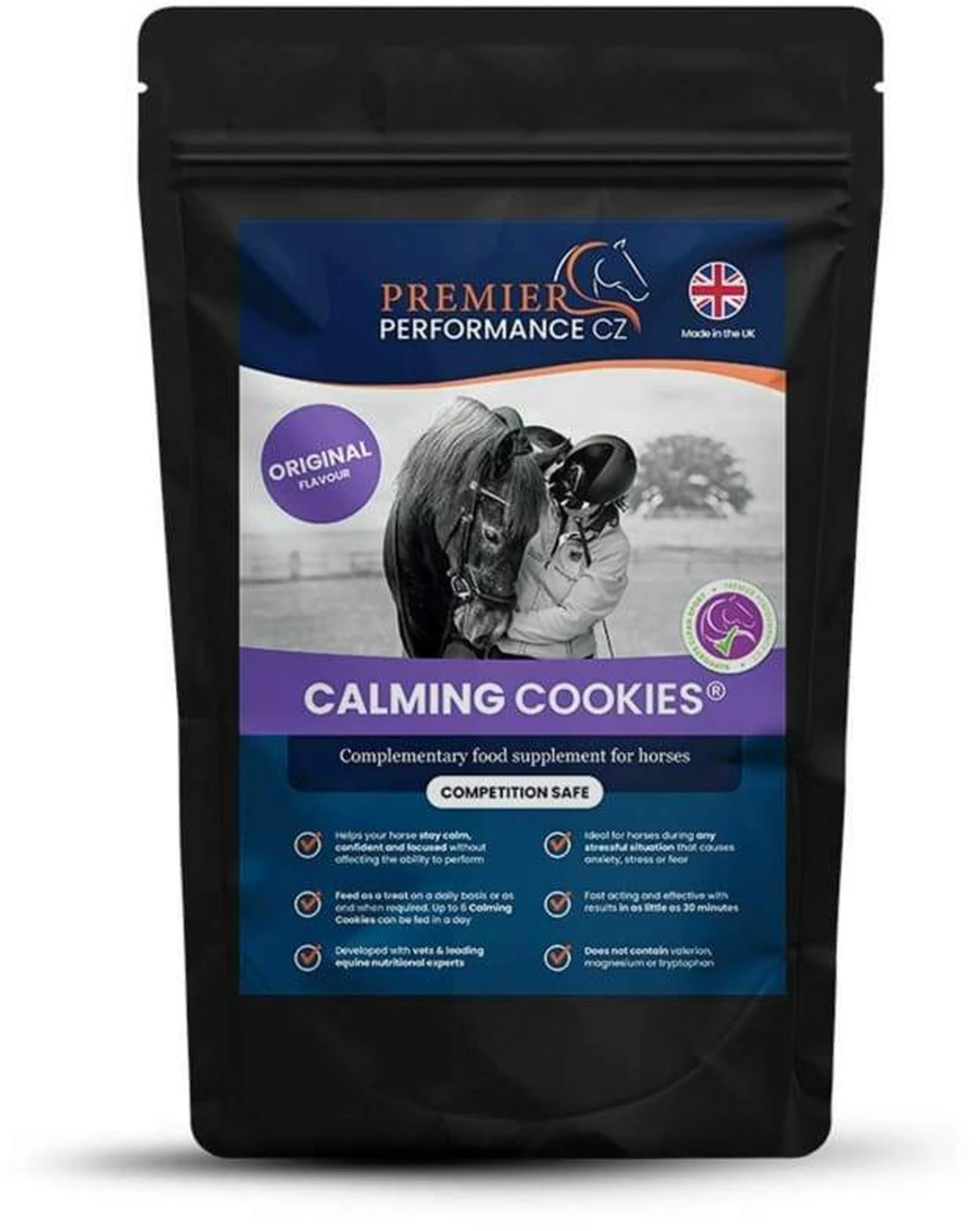 Premier Performance Calming Cookies Calming Cookies TM are ideal for horses during excitable or stressful situations such as clinics, competitions, clipping, hunting, farrier, box rest, training, loading, traveling and hacking.