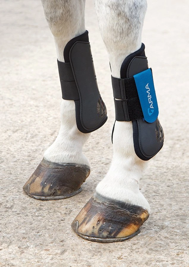 Shires Arma Tendon Boots offering protection to vulnerable areas whilst open straps allow the horse to feel his way. These ARMA open fronted tendon boots have a flexible, impact resistant hard outer shell which deflects blows on contact. The dense, perforated neoprene lining offers breathable, shock absorbing protection to tendons. Ergonomically shaped with smooth, rounded edges and recessed stitching for durability. Featuring double touch close fastenings with stretch inserts for comfort and security. Quick dry High impact protection, breathable cooling system and contoured for a superior fit. Durable and lightweight and at a great price !