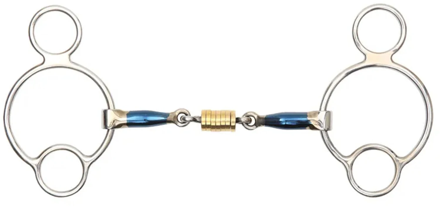 Shires Blue Sweet Iron Universal with Roller Link Combines poll pressure and leverage, for a mild gag action. The loose brass alloy discs in the centre can help to soothe a fussy tongued horse. Mouthpiece thickness: 15mm. Cheek height: 115mm (4.5″, 5″), 130mm (5.5″).