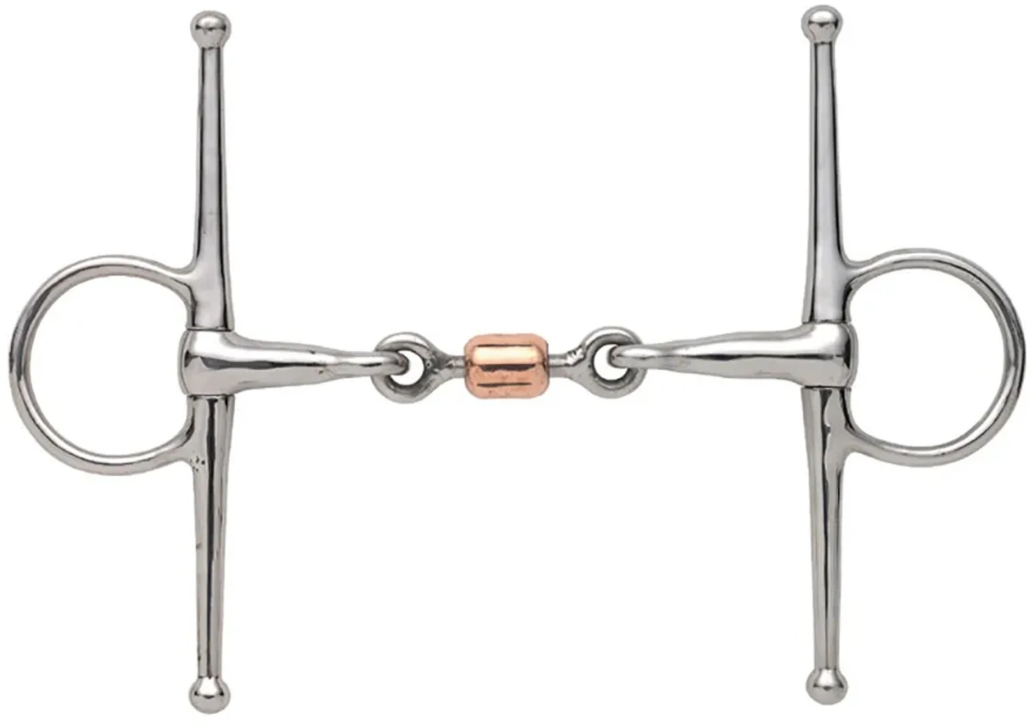 Shires Full Cheek Snaffle with Copper Peanut is a great bit for schooling. The peanut copper link in this bit provides a warm metal for the horses mouth and also helps to encourage salivation. Mouthpiece thickness: 13mm. Cheek height: 165mm.