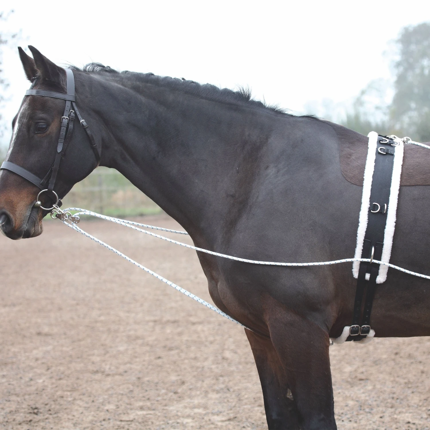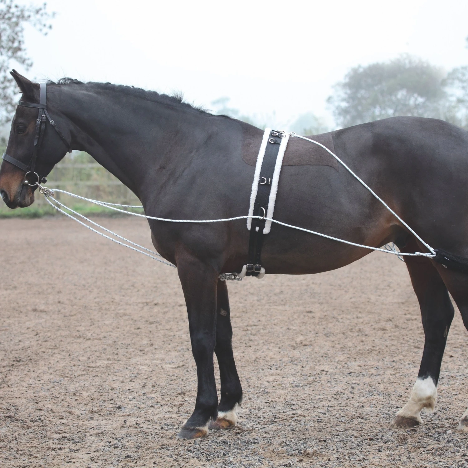 Shires Lunging Aid This training aid gently encourages the horse to work correctly by strengthening the back, stretching the top line, maintaining muscle tone and building muscle in youngsters. A simple rope and pulley system offers 4 levels of adjustment allowing the aid to be modified as the training progresses. Roller sold separately.