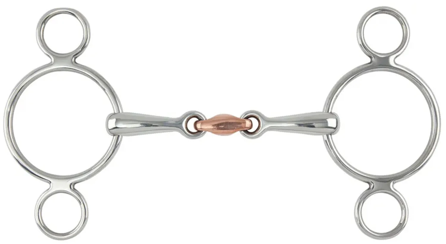 Shires Two Ring Copper Lozenge Gag allows the rein to be placed on either the main ring or smaller lower ring for more leverage whilst the copper lozenge encourages the horse to salivate. The 5″ and smaller sizes of this bit have smaller rings to ensure the bit remains in proportion. Mouthpiece thickness: 16mm. Cheek height: 120mm (4.5″, 5″), 145mm (5.5″, 6″).