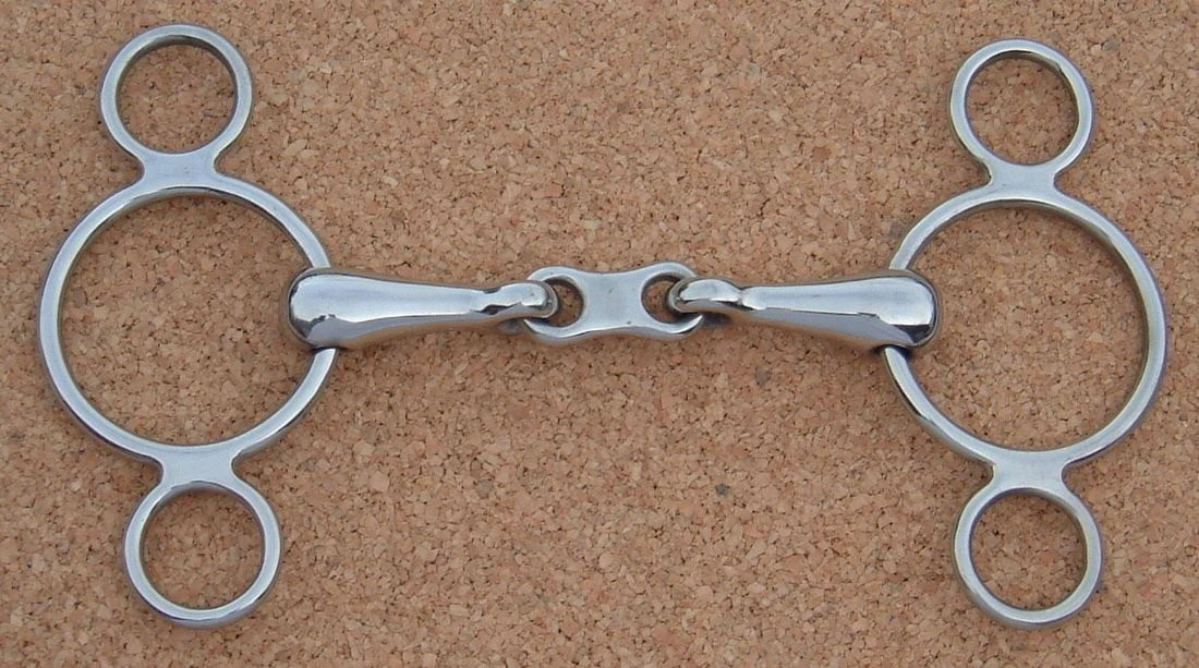 Show Jump French Link 2 Ring Gag the Continental Gag should be worn with 2 reins preferably; the first rein should be used on the snaffle ring, which is the first ring adjacent to the mouthpiece. When the first rein is attached to the snaffle rein it is used just like a loose ring hanging cheek bit, which uses poll pressure and lip pressure due to the sliding loose ring also applies various pressures in the mouth depending on the mouthpiece it is in conjunction with. When the second rein is attached to the ring below, the pressures are increased as the lower rings produce more leverage. In the instance of using 2 reins then this bit can be used as a hanging cheek bit and then when more help is required, the second rein can be brought into play. If the bit is only used with one rein on the lower ring, then the pressure in applied constantly and no pressure release is available for the horse. The gag produces a head raising action and is often used for cross country and/or jumping where the head needs to be raised quickly in order to gain control and so to get ready for the next jump. The French link has proven one of the most popular mouthpieces; it has 2 joints, which means the pressure of the bit is distributed over both the tongue and bars of the mouth. Because the mouthpiece has two joints, it shouldn’t cause any interference with the roof of the mouth. The French link uses tongue pressure to encourage the horse to go on the bit and has bar and lip pressure but not a squeezing action like that of a bit with a single joint. The more joints a bit has the less likely the horse is to lean as the bit becomes more mobile