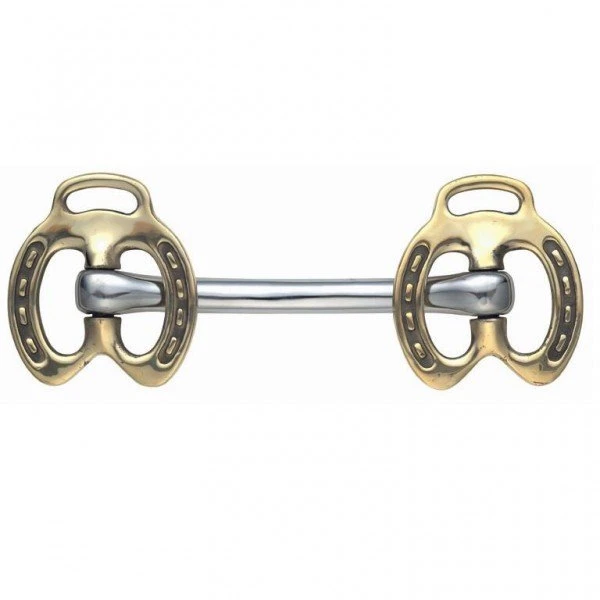 Stallion Bit has a straight fairly thick mouthpiece with Horseshoe brass rings either side for a traditional showing look.