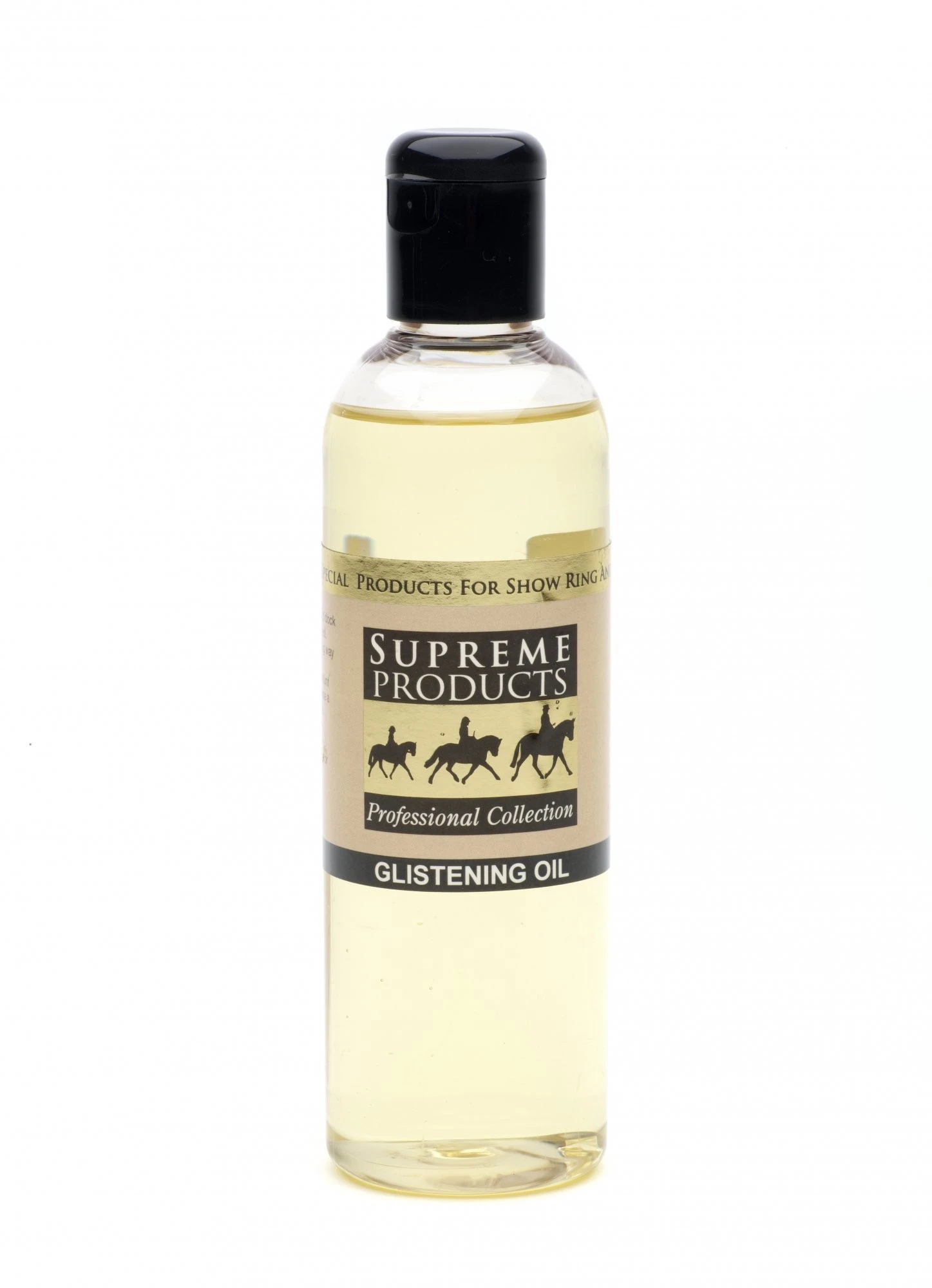 Supreme Products Glistening Oil a superior blended light grooming oil adds the final touch for show preparation. Can be used around the eyes and muzzle as well as down the legs and on the coat to highlight your horse’s best points. Excellent finish for sunny days and evening performances. Contains UV protection.