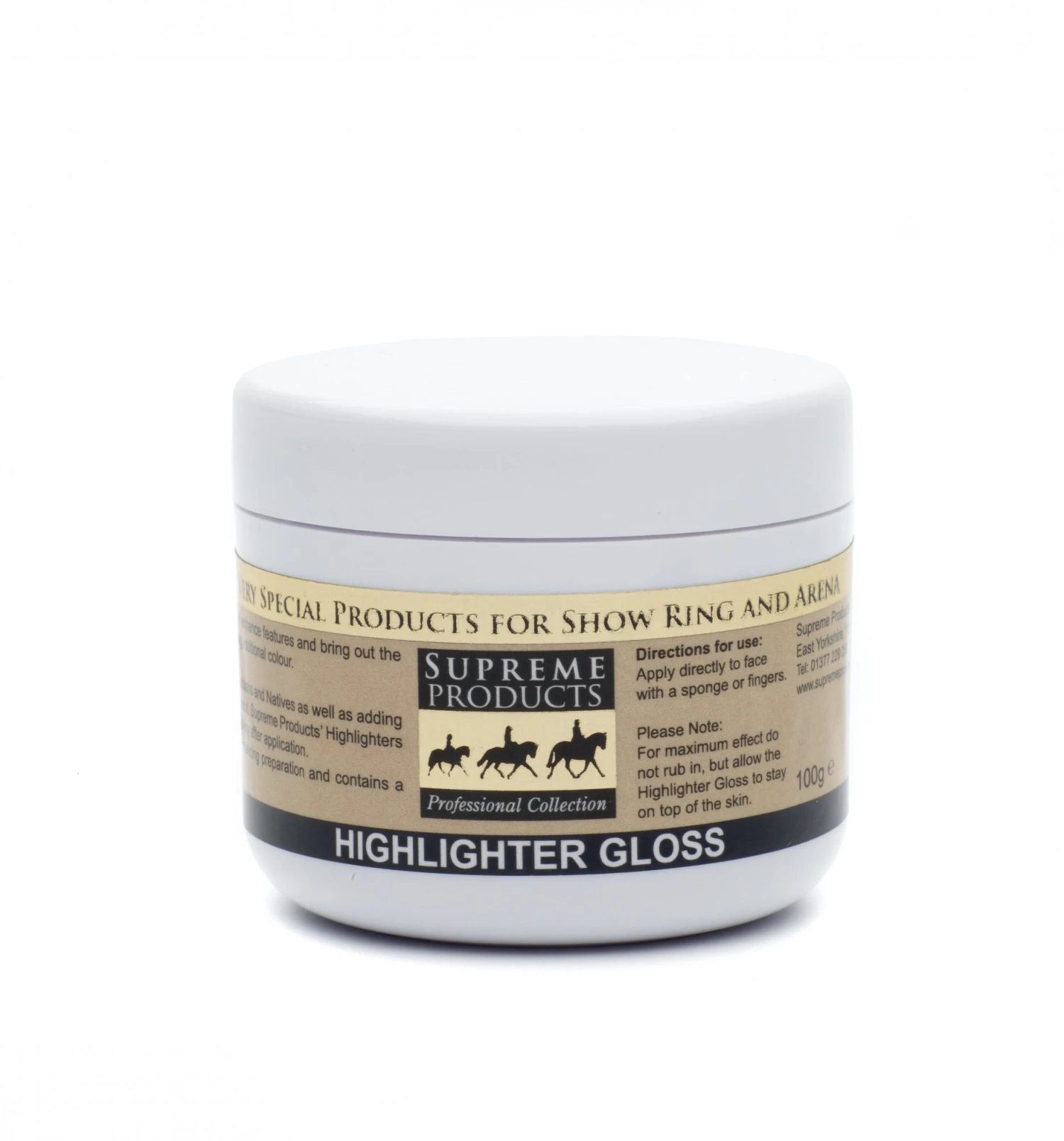 Supreme Products Highlighter Gloss enhance your horse’s best points with this highlighter gloss. Excellent for use when coloured preparation products are not allowed. A fabulous finish is achieved on eyes, nose, muzzle and dock area. Contains UV protection to help prevent sunburn.