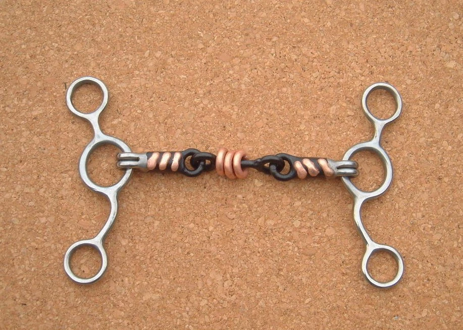 Sweet Iron Tom Thumb Bit this is a popular bit amongst showjumpers, being similar in action to an American gag but without the action of the mouthpiece being raised up in the horses mouth. The shank of the Tom thumb bit gives leverage and encourages the horse to keep his carriage lower as well as providing brakes. The combination of sweet iron and copper makes the bit very palatable and almost all horses will salivate and soften in response to the taste. The loose ring copper players in the centre give the horse something to think about, and often help to soothe a fussy tongued horse.