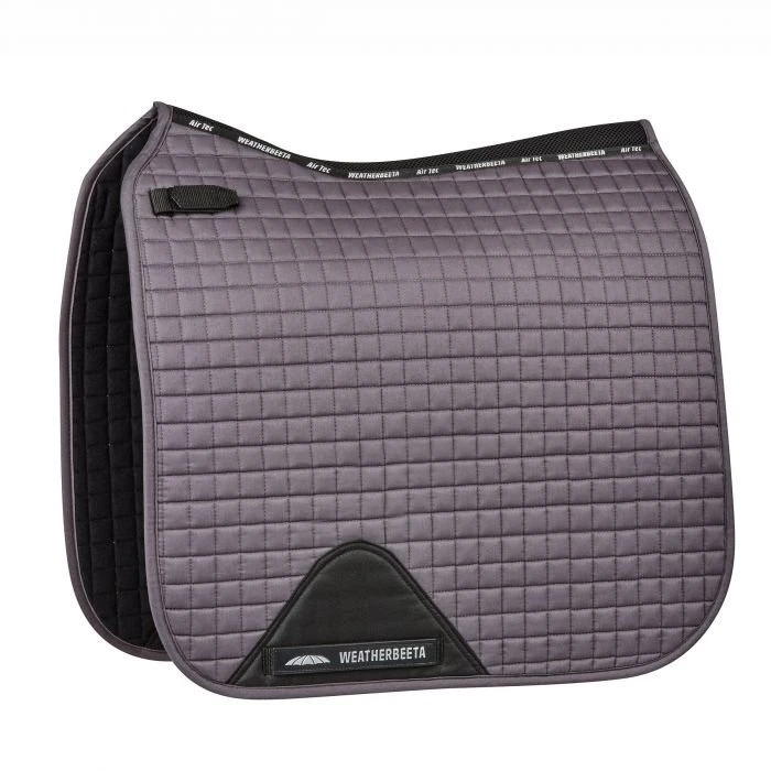 WeatherBeeta Prime Dressage Grey Saddle Pad is a durable cotton pad with a polyester wick easy lining helping to keep your horse cool, dry and comfortable. The breathable mesh spine allows extra airflow to the horse’s back, whilst the longer shape is designed to sit perfectly with a dressage saddle and the high wither design allows extra space where needed. The covered girth patch offers durability and the touch tape girth loops allow for a versatile fit. Easy attachment to the D-rings is made simple with short touch tape loops for a secure fit and the high wither design allows for extra space to assure maximum comfort for the horse.