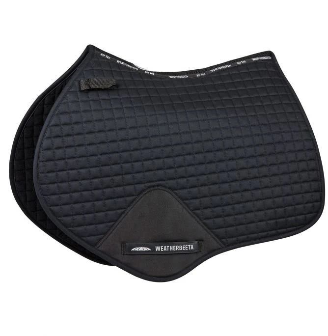 Weatherbeeta Prime Jump Black Saddle Pad is a durable cotton pad with a polyester wick easy lining helping to keep your horse cool, dry and comfortable. The breathable mesh spine allows extra airflow to the horse’s back, whilst the pad is designed to fit more forward cut jumping saddles with a high wither design to allow extra space where needed. The covered girth patch offers durability and the touch tape girth loops allow for a versatile fit. Easy attachment to the D-rings is made simple with short touch tape loops for a secure fit and the high wither design allows for extra space to assure maximum comfort for the horse.