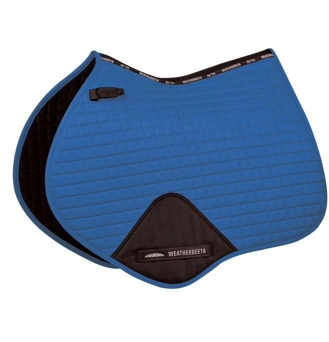 Weatherbeeta Prime Jump Royal Blue Saddle Pad is a durable cotton pad with a polyester wick easy lining helping to keep your horse cool, dry and comfortable. The breathable mesh spine allows extra airflow to the horse’s back, whilst the pad is designed to fit more forward cut jumping saddles with a high wither design to allow extra space where needed. The covered girth patch offers durability and the touch tape girth loops allow for a versatile fit. Easy attachment to the D-rings is made simple with short touch tape loops for a secure fit and the high wither design allows for extra space to assure maximum comfort for the horse.