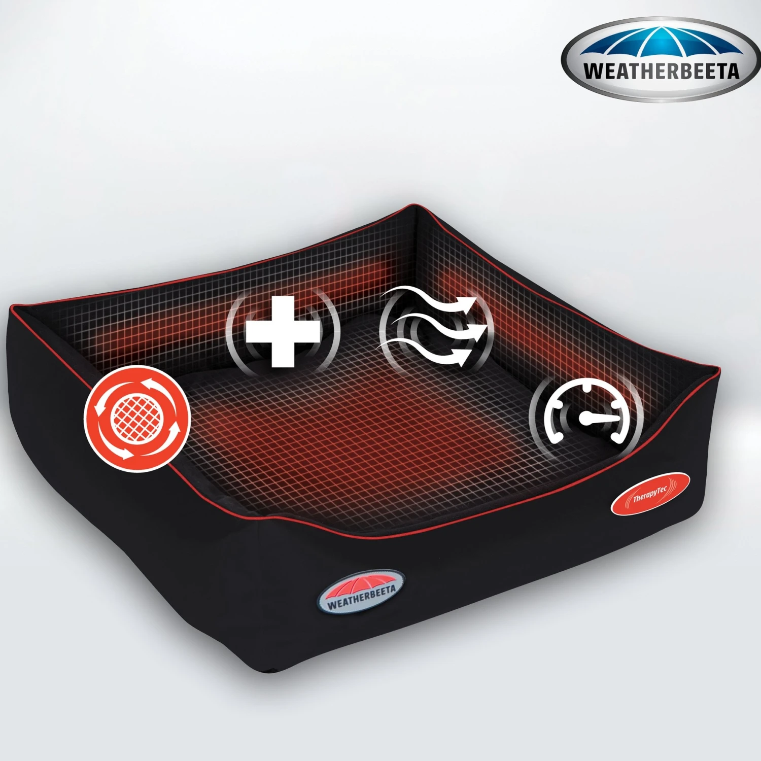 Weatherbeeta Therapy-Tec Dog Bed features an innovative ceramic lining that reflects and retains body heat which assists with pain management and inflammation. It’s the perfect choice for dogs suffering from pain associated with arthritis and hip dysplasia, especially over cold winter months. It’s also ideal for active dogs, pre or post exercise, to warm up and down, where the ceramic lining assists with recovery by reducing build up of lactic acid. The WeatherBeeta Therapy-Tec Dog Bed features ceramic fleece lining on the inner sides and the upper side of the removable pillow offering the ultimate in comfort. The outer sides are 600 denier for durability, each side panel features a zip to along the base for easy care. If machine washing, wash outer only at a low temperature, max 30 degrees on a gentle cycle. Line dry. Do NOT tumble dry or dry clean, do not use bleach.